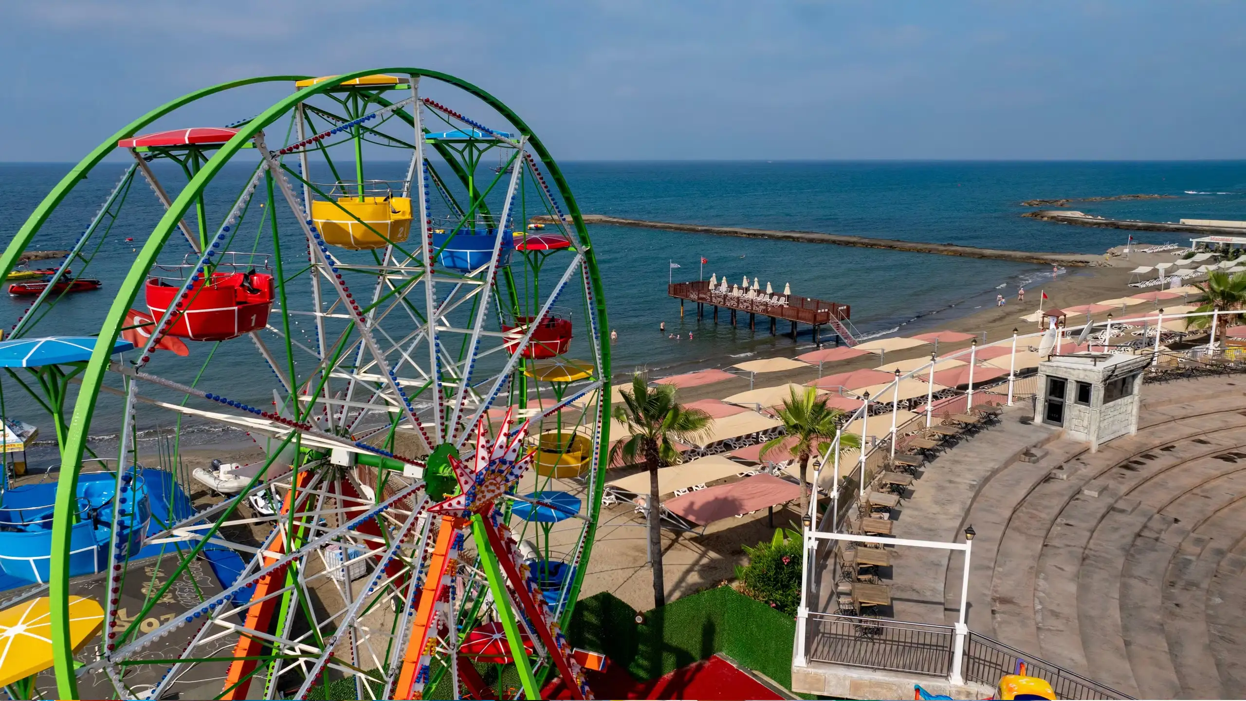 Plajda iskele, snack restoran, içecek alanı, sahil aquapark ve amfitiyatro bulunuyor.Ayrca engelli misafirler için özel olarak düzenlenmiş şezlong alanı bulunuyor.